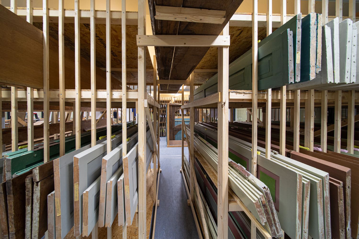 Naast het digitale systeem hebben we in de tenderfase een oplossing gevonden voor de opslag van alle monumentale interieuronderdelen: een ketenpark in de oksel van het paleis. Zo waren de onderdelen snel in een geconditioneerde ruimte en hebben we schade kunnen voorkomen. We bedachten een toren van geklimatiseerde keten waar we per verdieping rechtstreeks de delen naartoe konden brengen. Om ervoor te zorgen dat deze toren vanuit de tuin niet te storend zou zijn, is deze voorzien van een steigerdoek met print van het paleis.